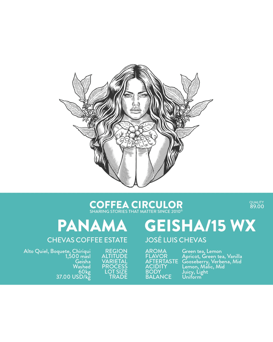 Cafeaua Panama Chevas Geisha /15 Washed WX de la Coffea Circulor provine din regiunea Alto Quiel, Boquete, Panama, la o altitudine de 1500 m. Această varietate Geisha este procesată washed și oferă un profil aromatic elegant, cu note de caise, ceai verde și vanilie.